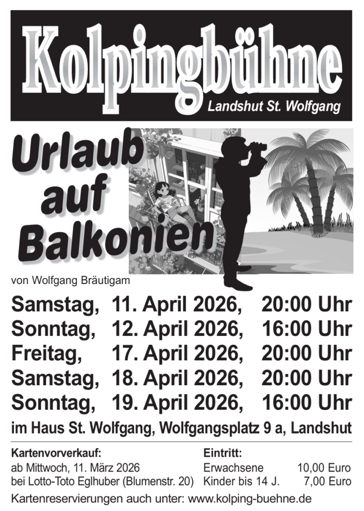 Die Kolpingbühne Landshut St. Wolfgang bringt im April 2026 wieder beste Unterhaltung auf die Bühne. Gespielt wird die Komödie „Urlaub auf Balkonien“ von Wolfgang Bräutigam.